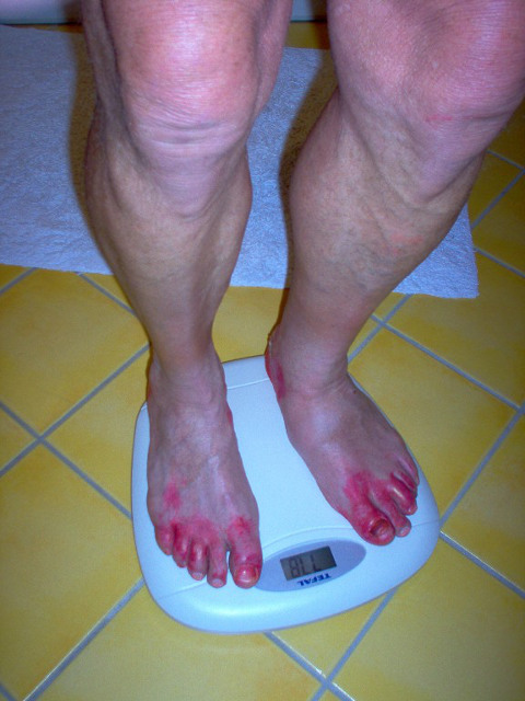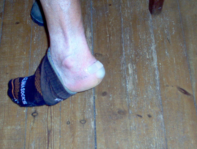 Ce n'est pas le pied ! Les ampoules sont toujours là ; j'ai marché plus de 100 Kms avec une sandale au pied gauche. |