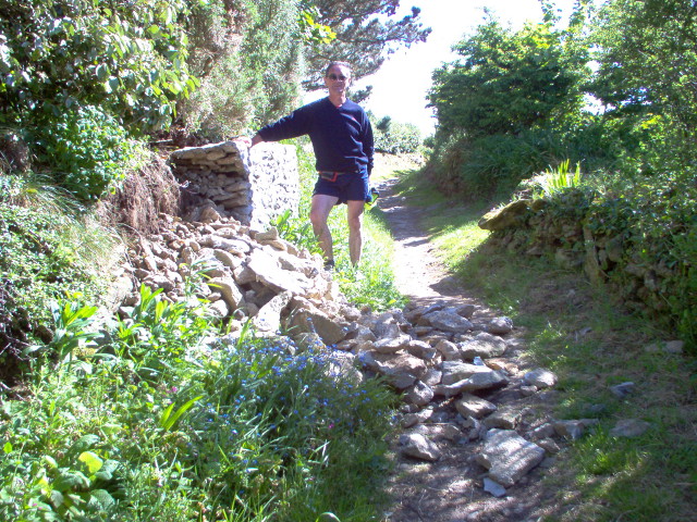 29 ème jour sur le GR 34 à Portsall sur le petit chemin qui descend du Guiligui à L'Abéric, un muret s'est effondré avec les pluies d'orage du matin, pourrons-nous passer demain ?