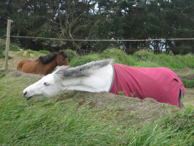 Bizarre ! Aujourd'hui, les poneys sont habillés. Pas étonnant, dirait Tante Mimi, ce sont les Saints de glace !
